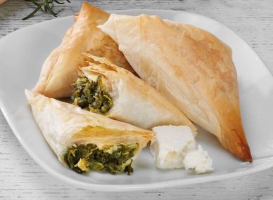 A classic blend of fresh chopped spinach and feta cheese wrapped in crispy, flakey layers of phyllo dough.