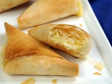 A traditional blend of tangy feta and cream cheese wrapped in crispy, flaky layers of phyllo dough.