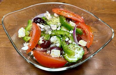 Cucumber, tomato, onion, bell pepper, Kalamata olives, oregano, and dressed in Greek olive oil, red wine vinegar, and topped with feta cheese.
