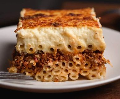Greek lasagna made from layers of seasoned ground beef, cheese, tomato and noodles topped with a delicious béchamel sauce.