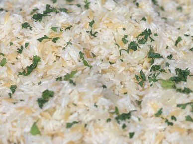 Our flavor packed lemon rizi is made with rice, orzo, garlic and topped with fresh parsley.